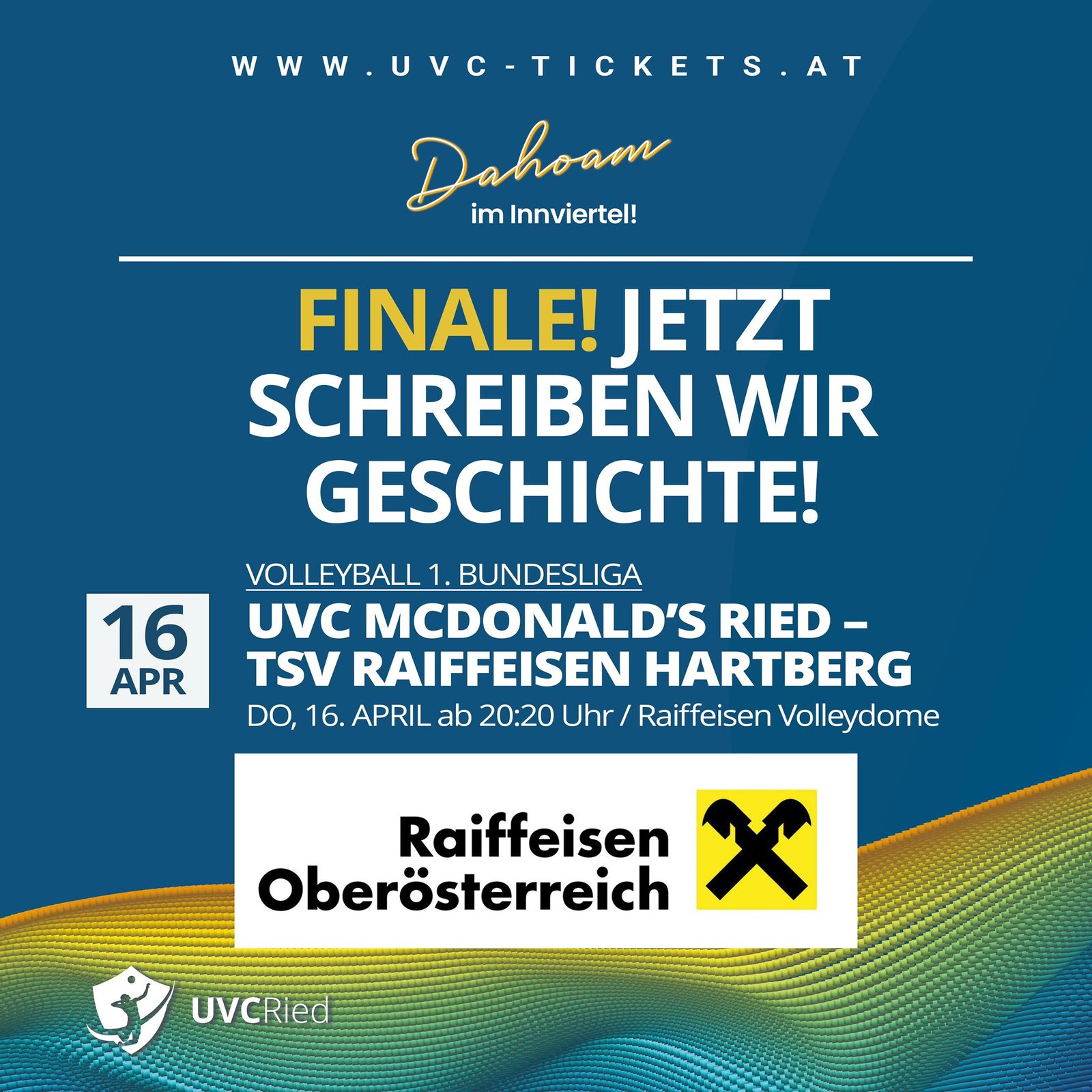 Am Donnerstag, den 16. April 2026, ab 20:15 Uhr findet ein historisches Spiel im Raiffeisen Volleydome statt. Der UVC McDonald’s darf zum ersten Mal in der Vereinsgeschichte ein 1.-Bundesliga-Finale dahoam im Innviertel austragen. Das Spiel wird präsentiert von Raiffeisen Oberösterreich.